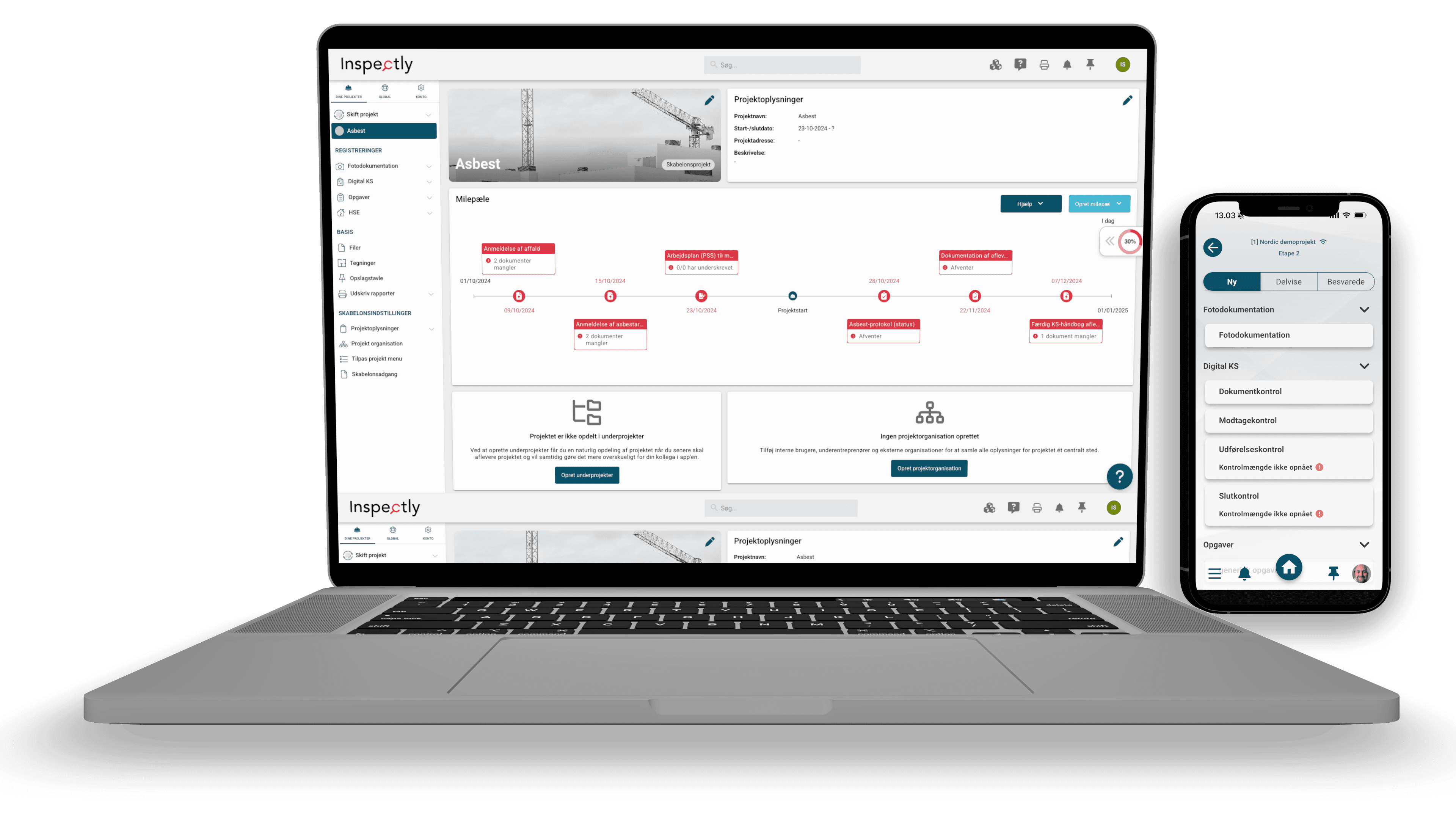 Brug Inspectly til at sikre I nemt kan lave alle registringer på projekter, der sikrer I overholder alle dokumentationskrav og leverer høj kvalitet.